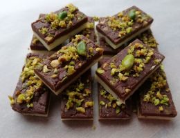 Hagyományos indiai édesség látványos modern köntösben. Kakaóval, pirított pisztáciával. Mennyei finomság!