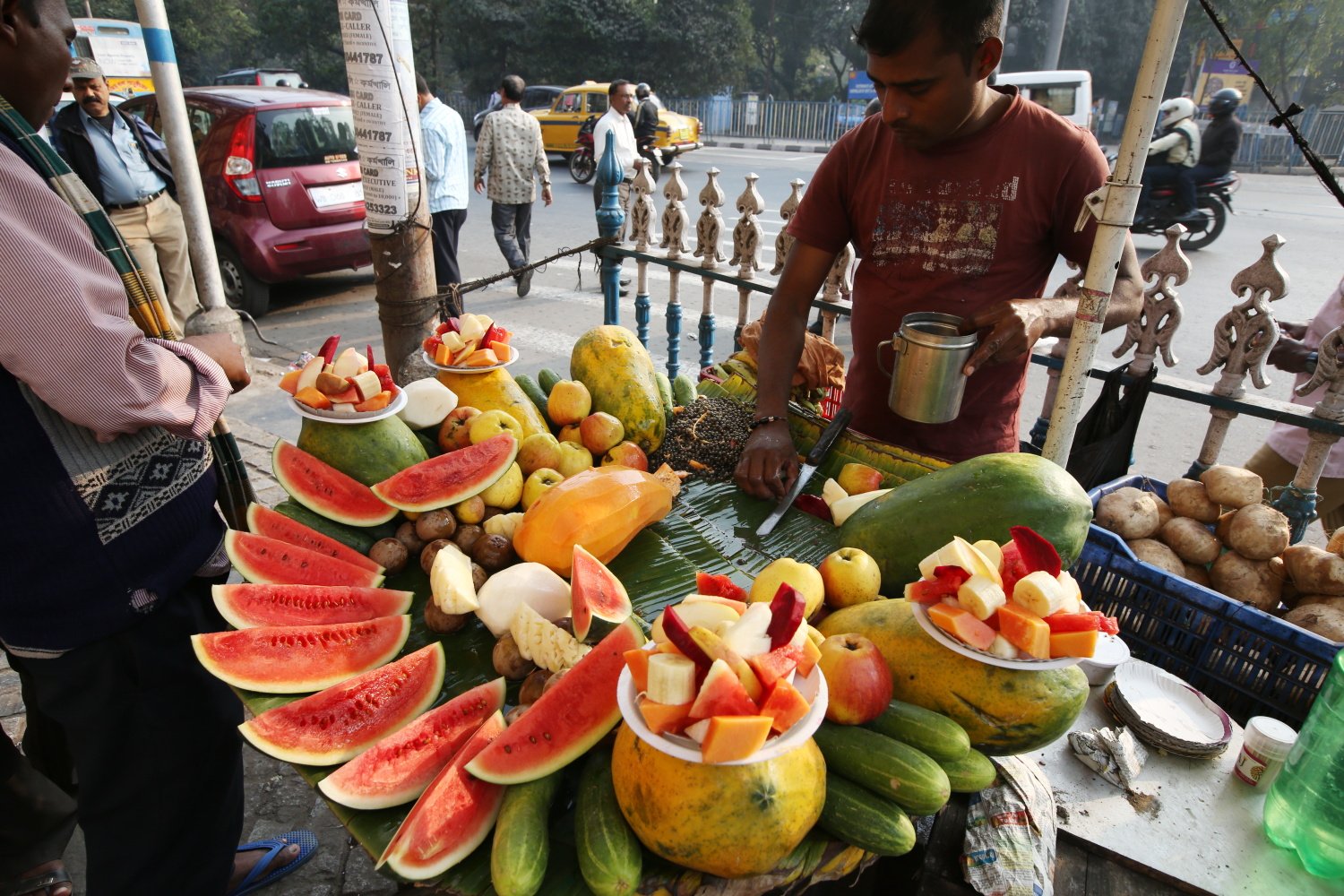 A legfontosabbak azonban a szaglószerveket és ízlelőbimbókat csiklandozó utcai kifőzdék, – ahol a járókelők szeme láttára készül a finomabbnál finomabb étek – mert valójában ezek tartják életben, látják el reggeltől estig élelemmel a szorgalmasan dolgozó embertömeget. Egy-egy apró étkezde és áruda maga az életre kelt indiai konyhaművészet. Mindent készítenek, ami szem-szájnak ingere: csilis-hagymás tojásrántottát, többfogásos ebédet, frissítő gyümölcssalátát, üdítő gyümölcslevet. A helyben pörkölt földimogyoró és a fekete sóval (kalá namak) ízesített friss uborka pedig egyszerűségében is a harapnivalók királya.