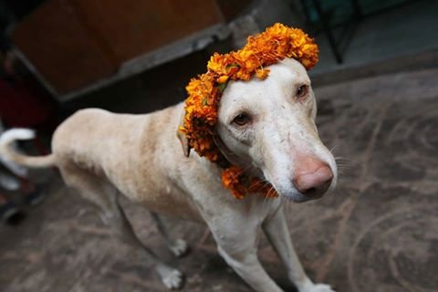 Nepálban a Diwali, a Fény Ünnepét Tiharnak hívják, és ennek az egyik napja a Kutyák Napja (“Every dog has its own day.” : )) ) Ilyenkor (bizonyára Indiában is, de ezt nem tudom), büdöske virágból készült virággarlandot aggatnak boldog-boldogtalan kutyára. A kóbor kutyákra is.