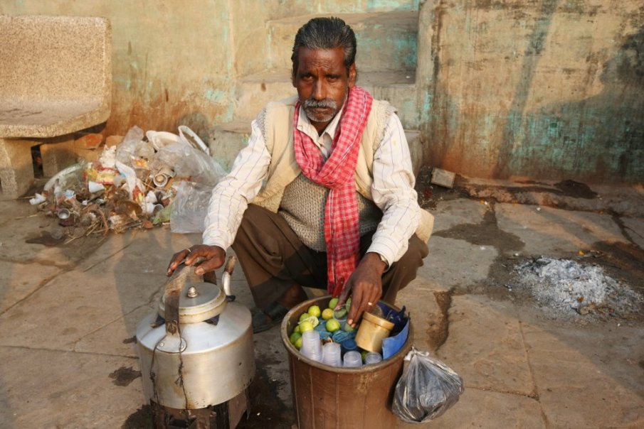 Fél kettő van. Óra nélkül is tudom, mert szinte percnyi pontossággal ilyenkor jelenik meg a teaárus. Már messziről felismerem a vékony testalkatú fiatalembert, aki egyik kezében faszén tüzelésű kályhácskára rögzített, hordozható bádog teáskancsót cipel. Másik kezében egy kis műanyag vödör. Szapora léptekkel közeledik, éber tekintettel pásztázza a tömeget, miközben hangosan kínálja portékáját: “chai, chai, nimbu chai” (tea, tea, citromos tea). Alig várom, hogy közelebb érjen, és tekintetünk találkozzon. Mert a teásra nem illik kiabálni, inkább csak alig észrevehetően inteni, bólintani feléje. Az én kedves teásom pedig szó nélkül is tudja, hogy ma is készíthet egy pohárnyi friss citromos teát. Bátran leteszi a kályhácskát és a nimbu chaihoz szükséges eszközöket tartalmazó vödröt. Kezébe veszi a kis papírpoharat, gyakorlott mozdulattal beleszórja a fűszerkeveréket, kifacsarja a nimbut – az apró indiai citromot – és felönti a forró édes fekete teával. Szemet gyönyörködtetően elegáns mozdulatokkal alkot, öröm nézni, ahogyan az előttem születendő citromos teát kevergetés gyanánt néhányszor áttölti az egyik pohárból a másikba. Egy csepp nem sok, még annyi sem veszik kárba. A pillanat tört része alatt elkészül az ínyenceknek való nedű. Egy kicsit sós, picit édes, és a fűszerek által ebben az italban is India ízei köszönnek vissza. Kitalálni sem lehetne jobbat, izgalmasabbat 🙂 🙂 🙂