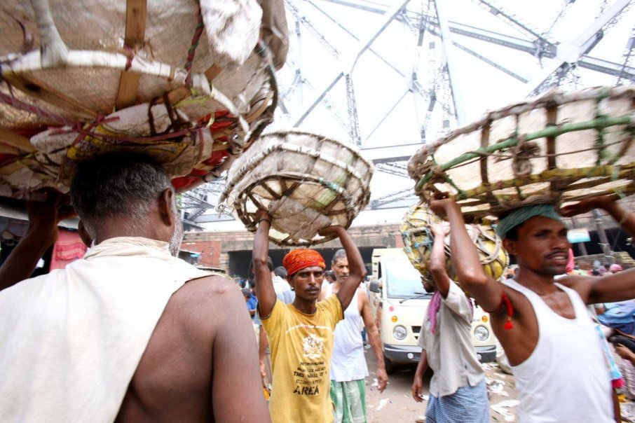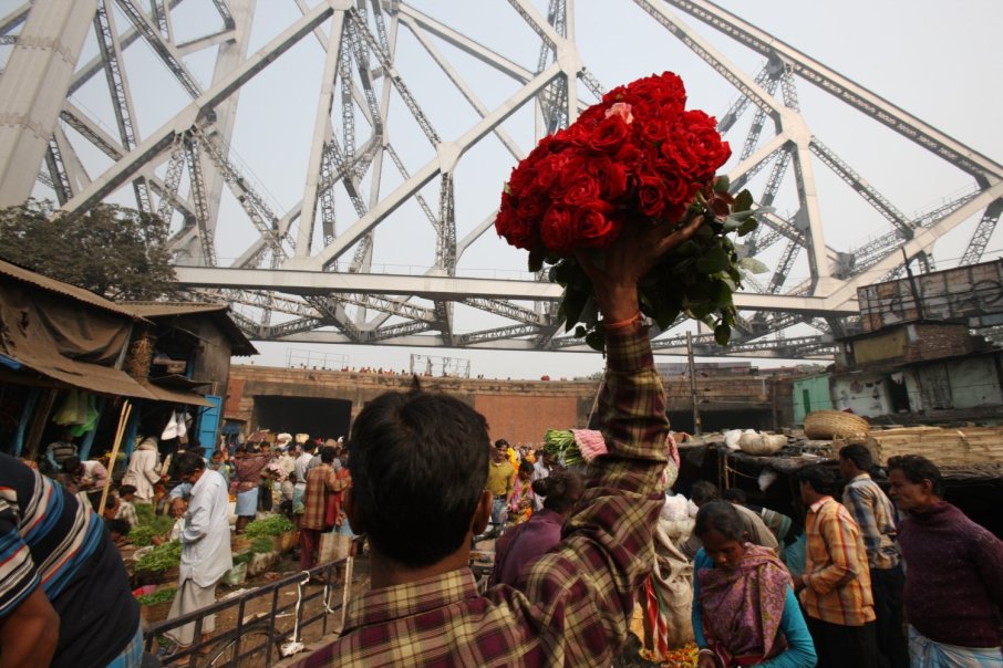A légies megjelenésű híd hat széles sávját a teherautók, buszok, személyautók, robogók véget nem érő áradata uralja kora reggeltől késő estig. A napi forgalom állítólag 100 000 jármű és 150 000 járókelő. Az óriási igénybevétel miatt a híd szinte lüktetve reng, úgy átveszi az áthaladó forgalom ritmusát. A perzselő hőség pedig a híd vasszerkezetét annyira kitágítja, hogy a híd nappal másfél méterrel hosszabb, mint éjjel. A gyalogos részen is megállás nélkül, hasonló iramban vonul az embertömeg. Közöttük cikázva haladnak a gyorsléptű kulik (hordárok), fejükön textillel letakart nehéz, hatalmas bálákkal, vagy akár egy méter magas kosarakkal. Ezek az óriási kosarak sokszor virágokkal vannak teli, ugyanis közvetlenül a Howrah híd lábánál található Kalkutta egy másik kihagyhatatlan nevezetessége, a híres virágpiac. De itt már jártunk. Emlékeztek rá? 🙂