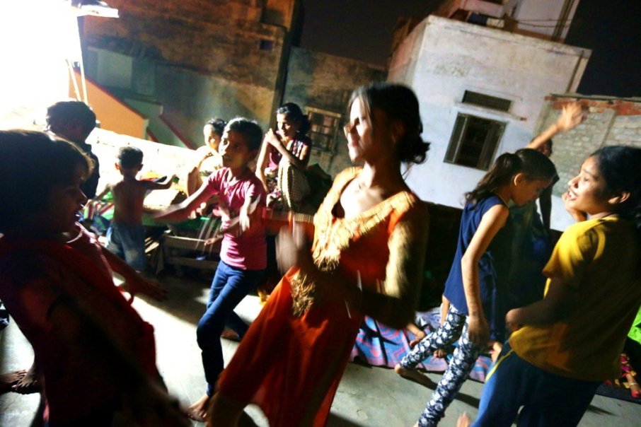 A nem éppen tágas tetőteraszon csaknem 50 ember, felnőttek és gyerekek, még a legkisebb Kallu is ott pörög-forog, csápol. A sarokban két hatalmas – legalább egy méter magas – hangfal, amiből ordít a helyi bhódzspuri slágerek ismert dallama. Egy darabka téglára beállítva az okostelefon, amin a tánclépéseket lehet követni, mert minden dalhoz más a koreográfia, és úgy kell táncolni, ahogy azt az adott előadó bemutatja. Ugyanaz a mozdulat, ugyanaz a mosoly. Most is fel tudjuk idézni, ahogyan Gollu és Szacsin, a két rosszcsont teljes valójukkal átadják magukat a zenének. Szakad róluk a víz, az égig ugrálnak kakaskodva, majd a földre is lefekszenek, hirtelen felugranak és folytatják egymást heccelve, ki milyen ügyesen tudja követni a zene ritmusát. Vagy amikor színházi előadásba illő módon táncol a szigorú nagynéni az aprócska Szacsinnal, amikor minden finom és kecses mozdulat – úgy, ahogyan sok száz évvel ezelőtt – az ifjú pár nászára utal.