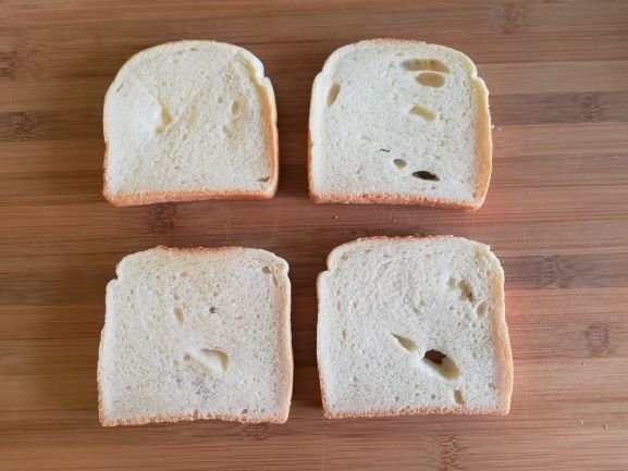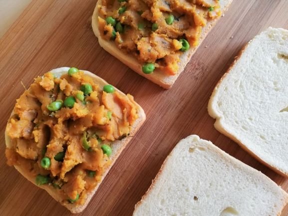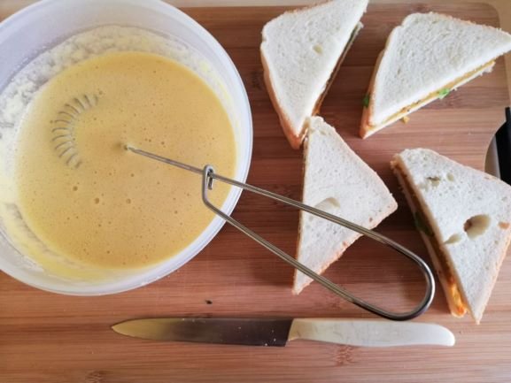- 4 toast kenyeret kenjünk meg burgonyás töltelékkel, majd fedjük le őket a másik 4 tiszta toast kenyérrel. Az így kapott 4 kenyérkét vágjuk átlósan ketté, így 8 darab háromszög alakú pakorit kapunk.