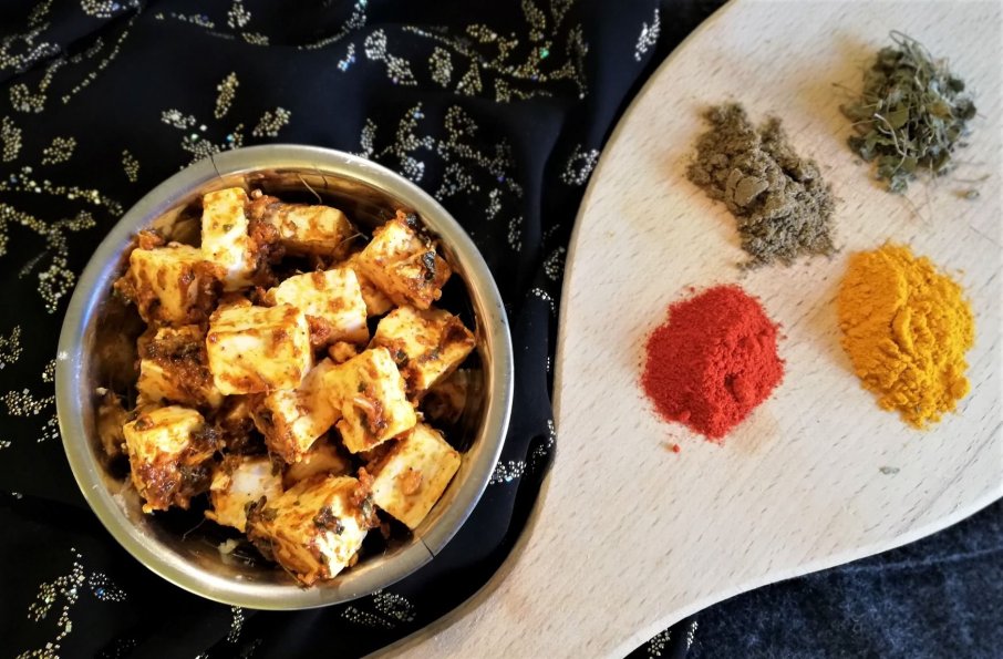 - 250 g nagyobb kockára vágott panír (indiai friss sajt) vagy halloumi
