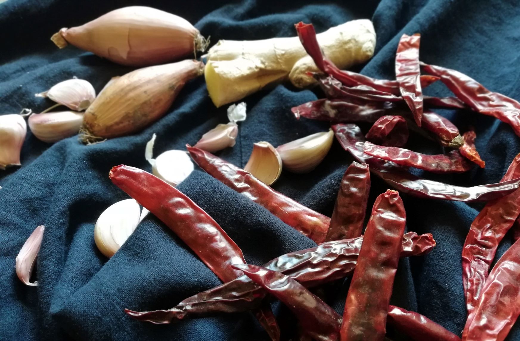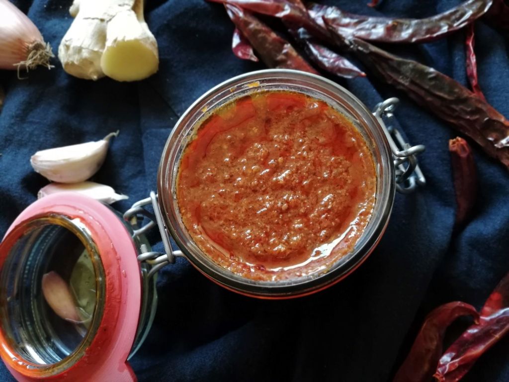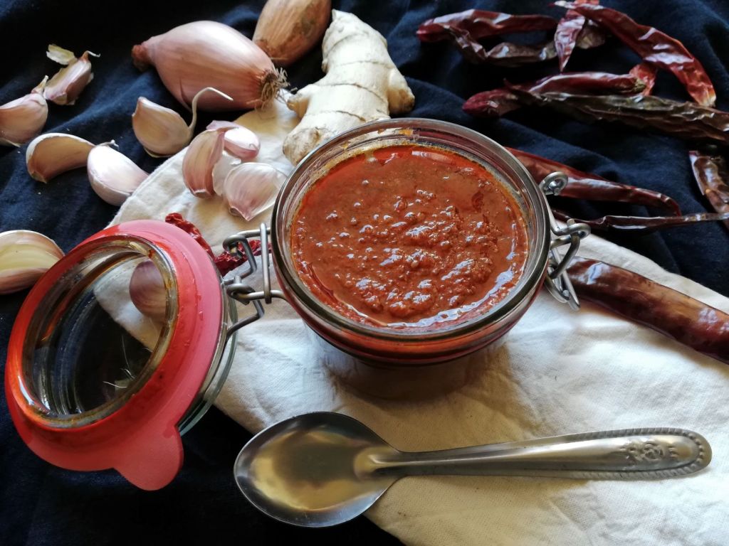 - A szárított fűszerpaprikát forrázzuk le, és hagyjuk legalább 30 percig ázni. A vizet öntsük le. A paprikákat vágjuk kisebb darabokra, vagy szeleteljük nagyon vékonyra, és mozsárban vagy késes aprító segítségével némi víz hozzáadásával zúzzuk finom pasztává.
