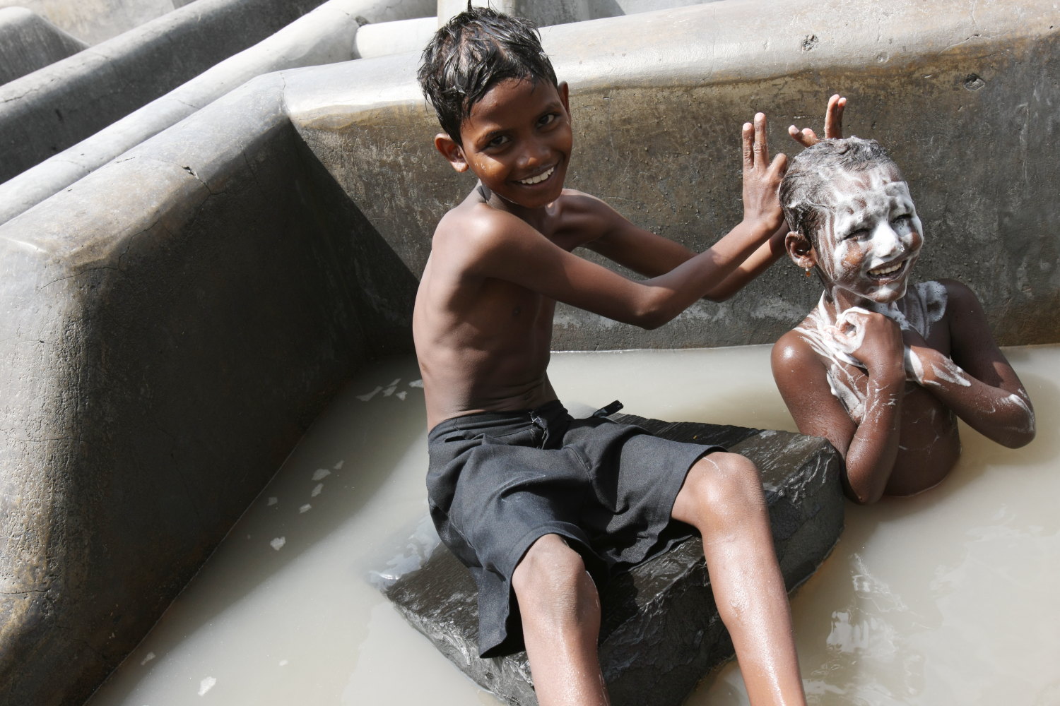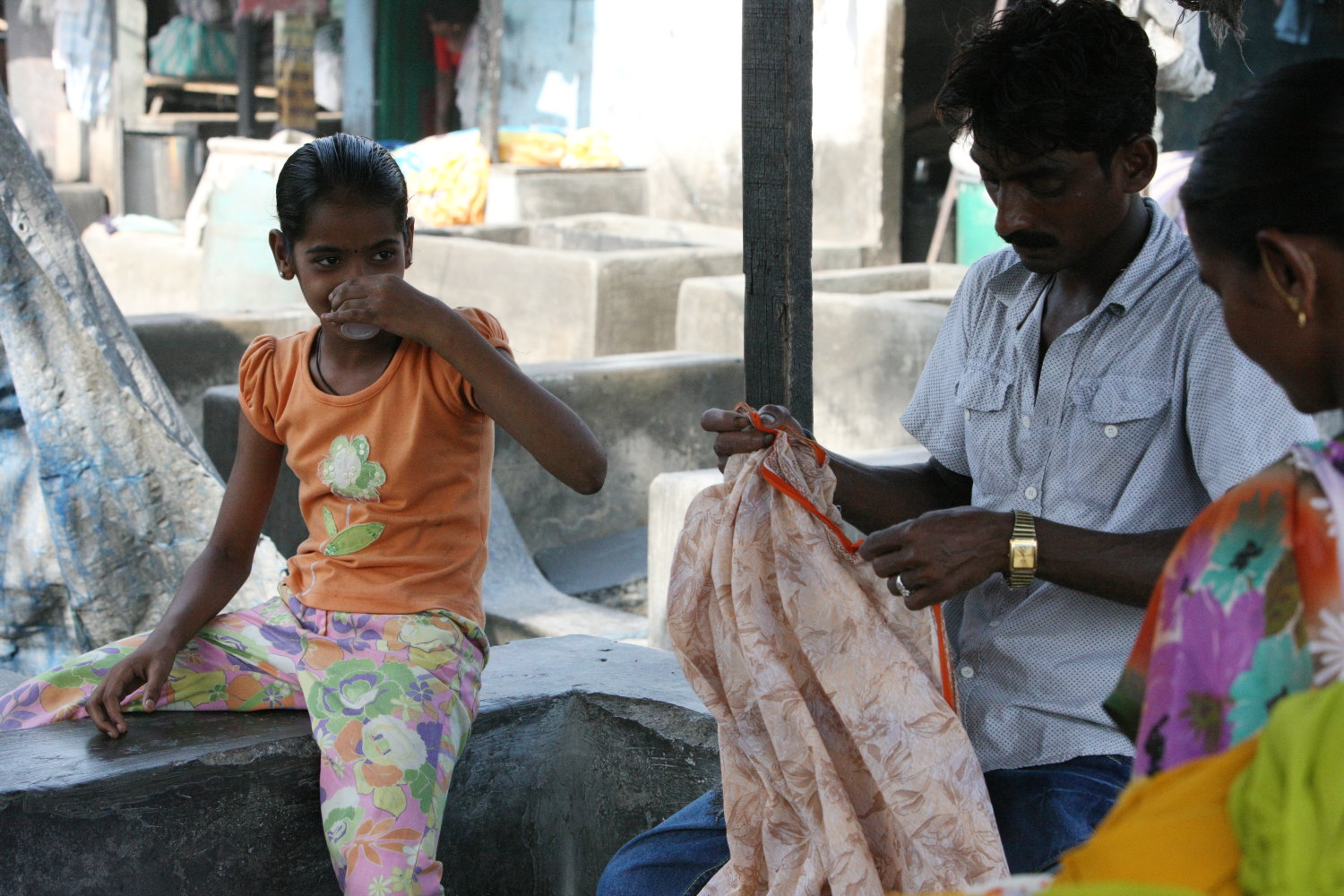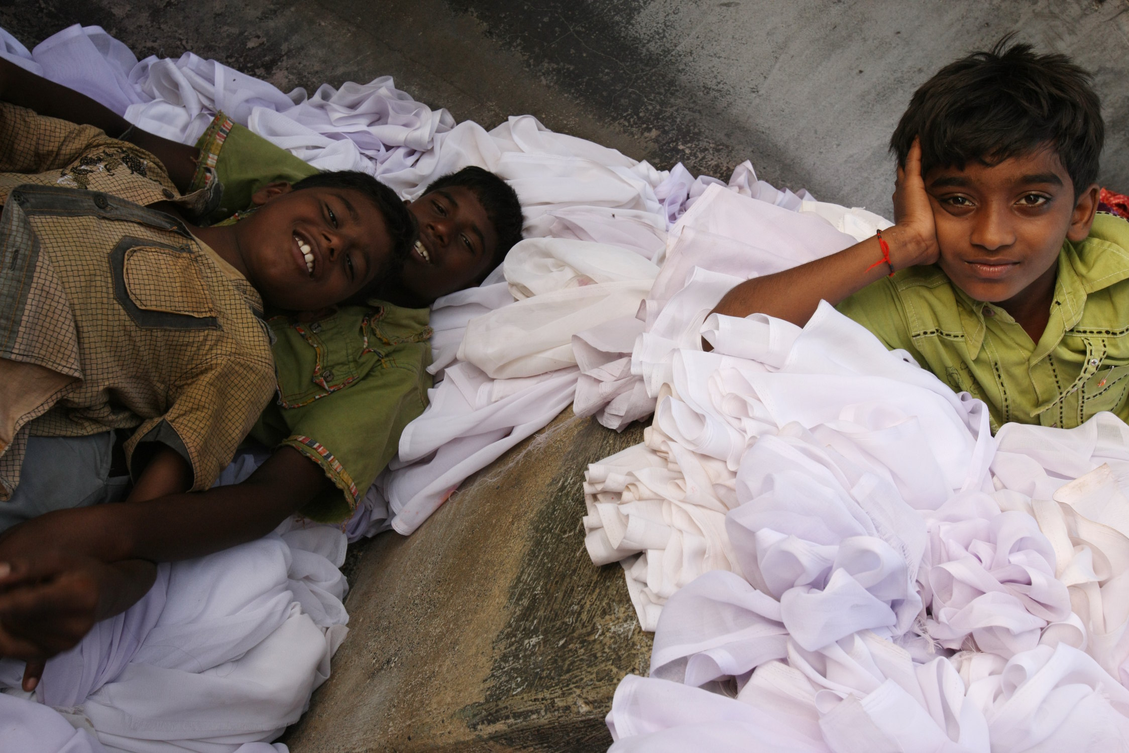 A Mahalaxmi dhóbi gháton kizárólag a mosóemberek kasztjából származó emberek dolgoznak. Van, aki a jószerencsének köszönhetően kapott itt munkát, többségük azonban megörököli a legfontosabbat, a mosómedence közepére helyezett “pattart”, a mosókövet, így tudják több generáción át biztosítani a család megélhetését. A dhóbik egy-két kivélteltől eltekintve nem állandó jelleggel élnek itt. A népes családok tagjai általában váltják egymást, évente legalább egyszer 1-2 hónapra hazautaznak a falujukba, a családhoz és a gyerekekhez. Ahogy barátaink, Lakshmí és Gangadar is az év nagy részét a nagyszülőkre bízott, bentlakásos iskolában tanuló gyerekeik nélkül éli. Csak a nyári szünetben találkoznak. Mielőtt azonban a nagy családi találkozásra a faluban sor kerülne, a gyerekek egyfajta nyaralásként néhány hetet Bombay-ben tölthetnek. Amikor megkezdődik a vakáció, akkor az egész dhóbi ghát megtelik gyerekzsivajjal, boldogsággal. A gyerekek játszanak, tévéznek, naphosszat pancsolnak és kedvükre lubickolnak a medencékben, vagy éppen fejest ugranak az ezernyi puha száriba. A felnőttek pedig hagyják őket, hadd élvezzék a gondtalanság mámorító napjait 🙂